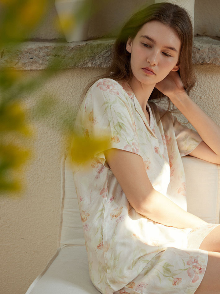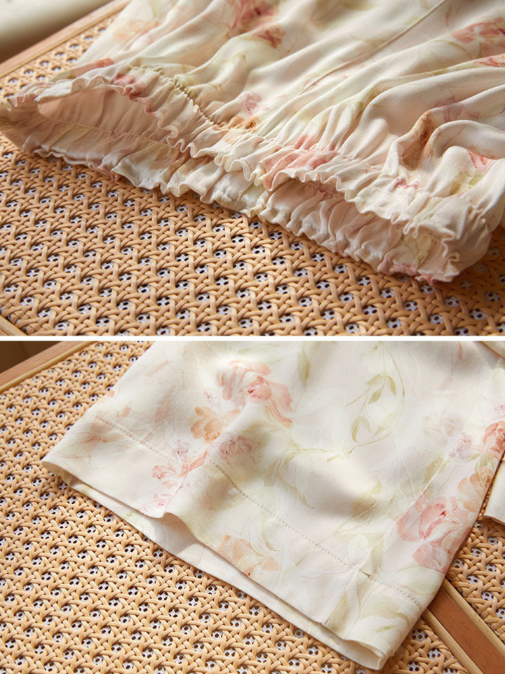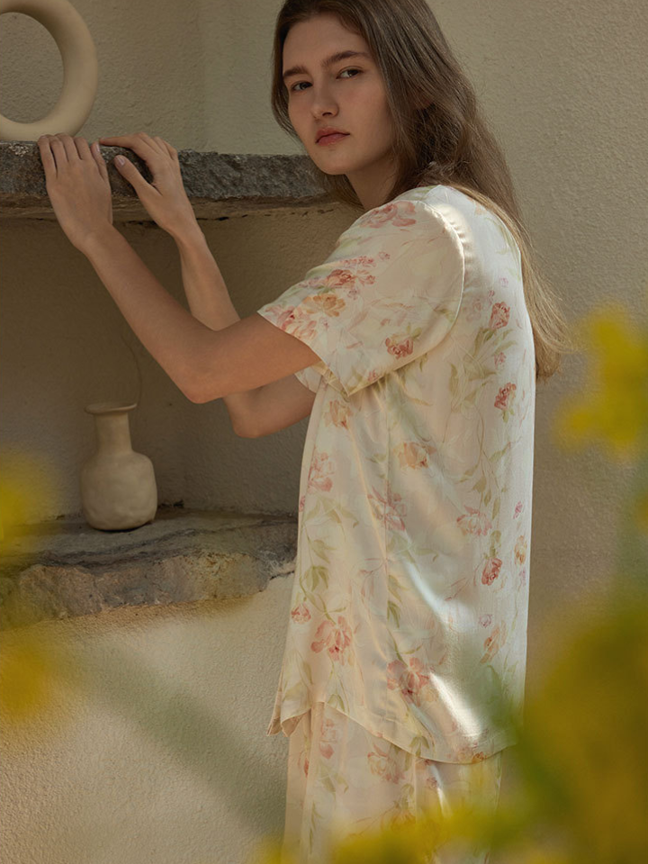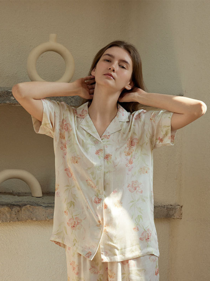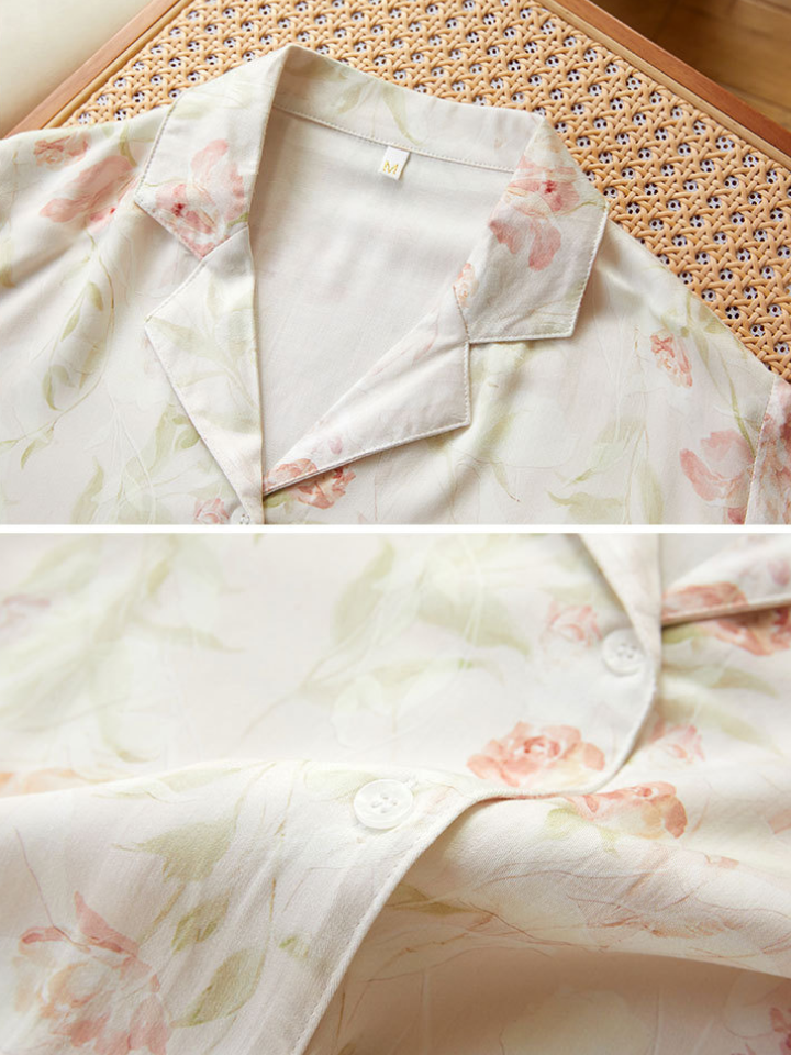 レーヨン素材でとろっとした滑らかな素材が魅力のフラワーパターンパジャマ。