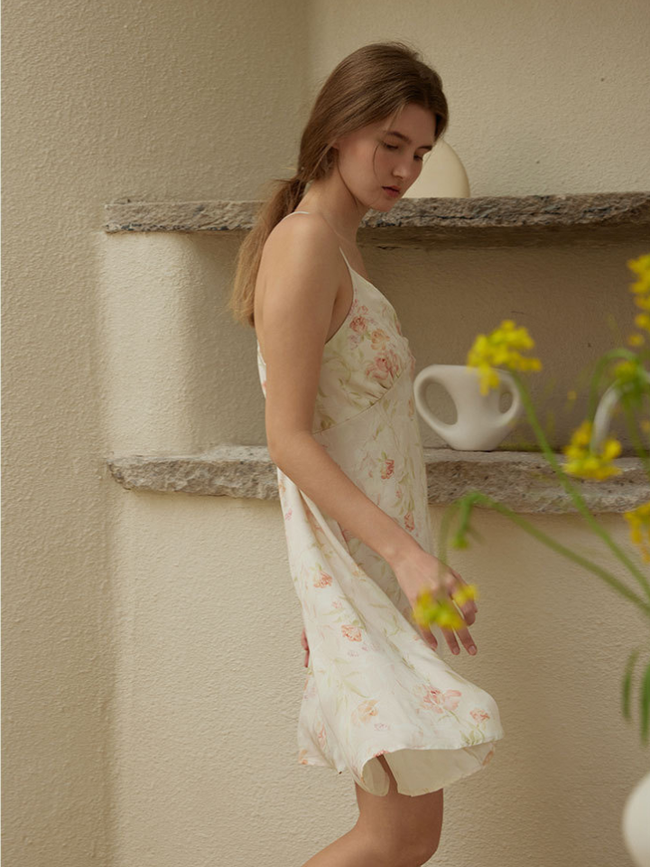 ダイナミックなフラワーパターンと色味がモードフェミニンなルームワンピ。
