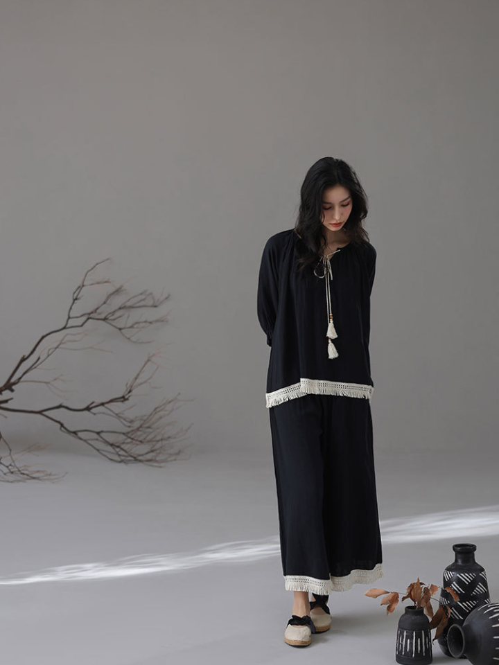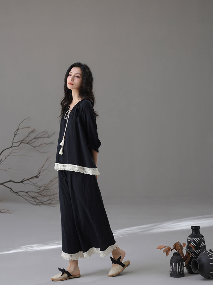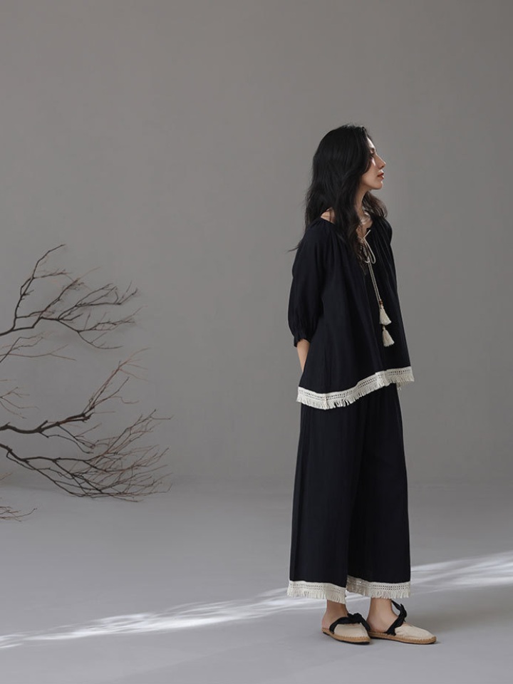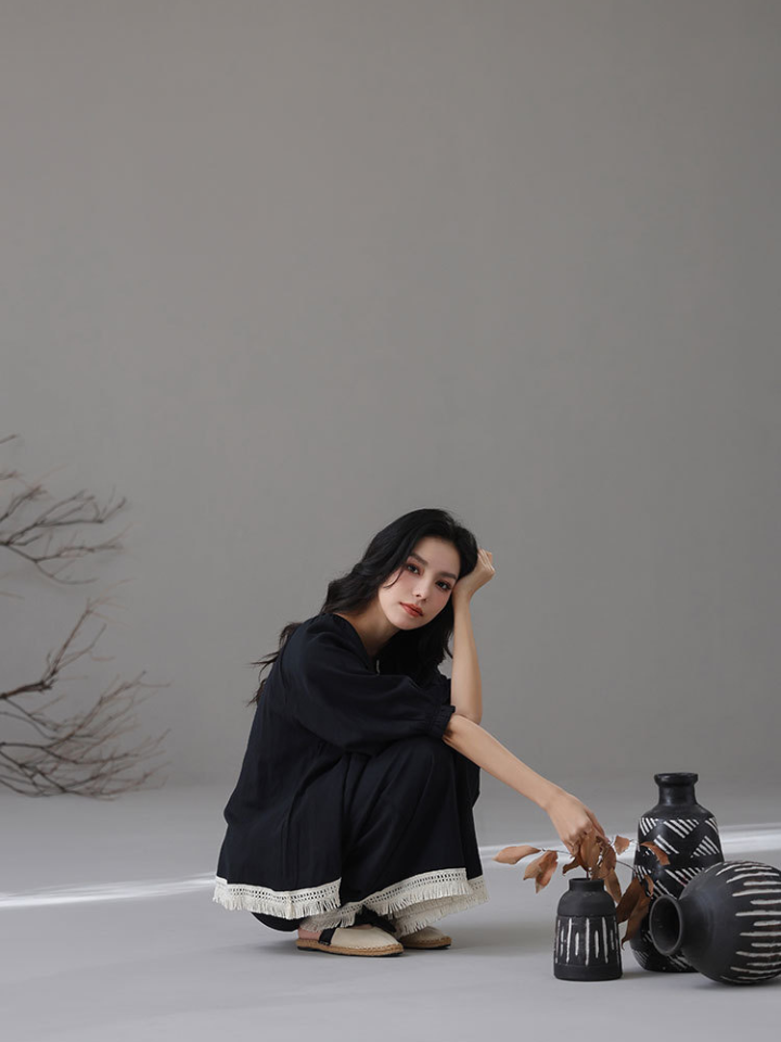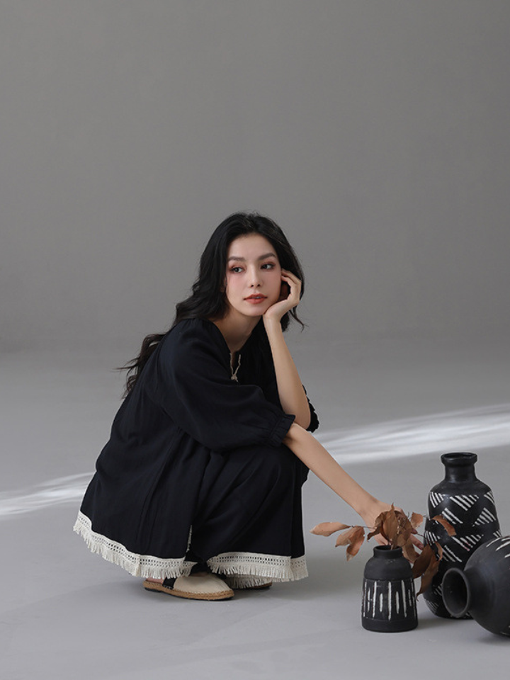 裾周りに配したホワイトフリンジが、動くたびに軽やかな陰影を演出。