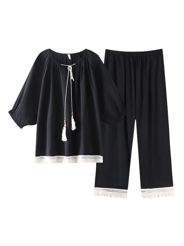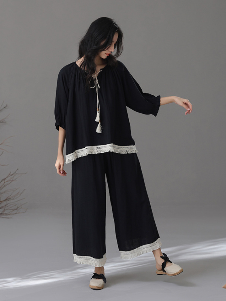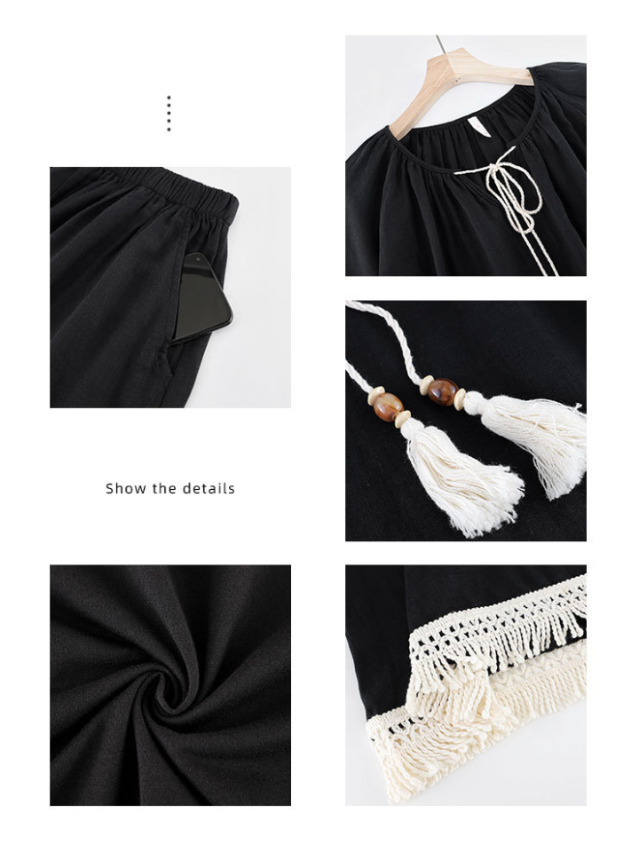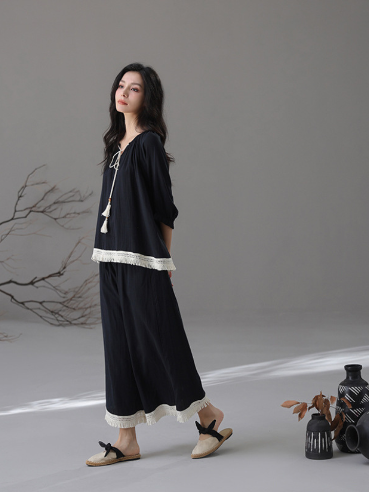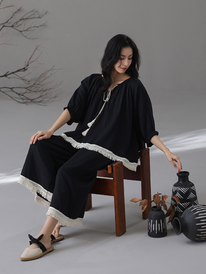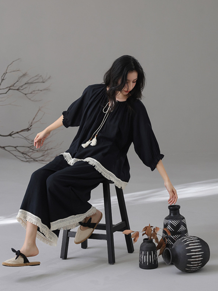 裾周りに配したホワイトフリンジが、動くたびに軽やかな陰影を演出。