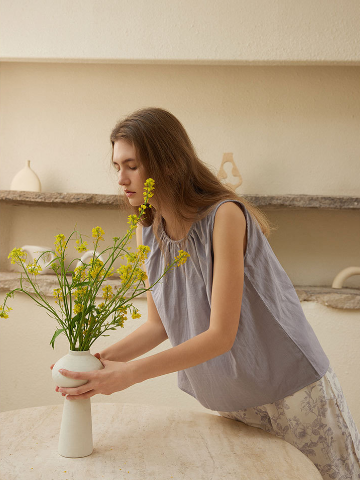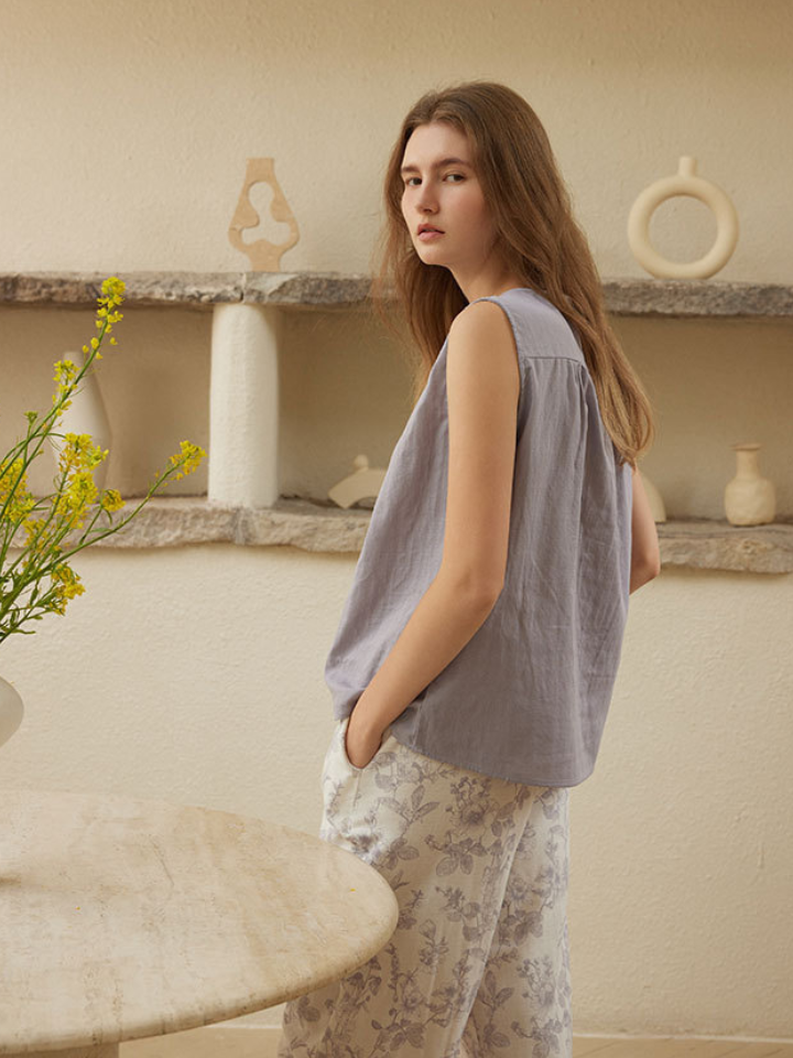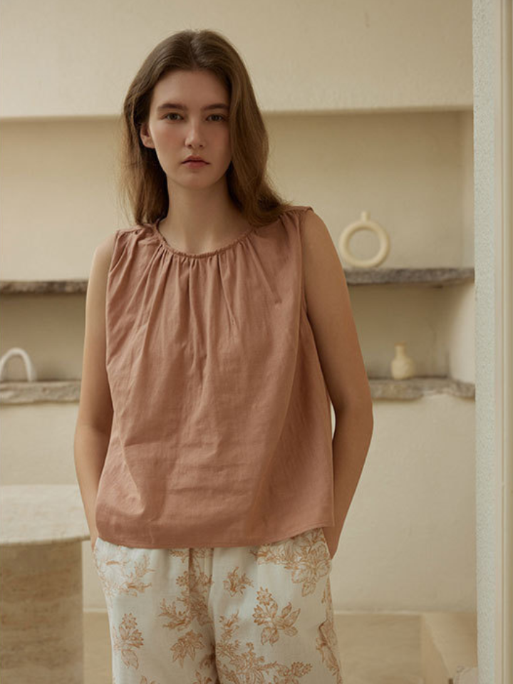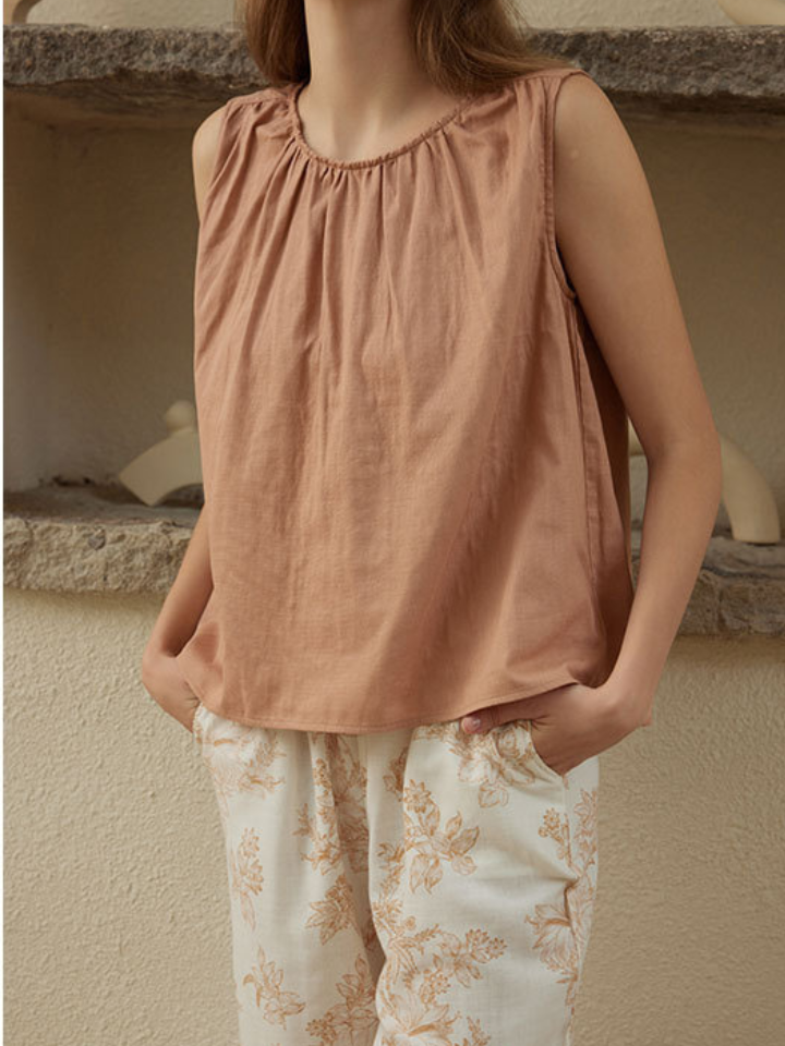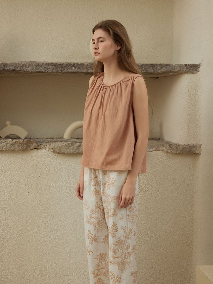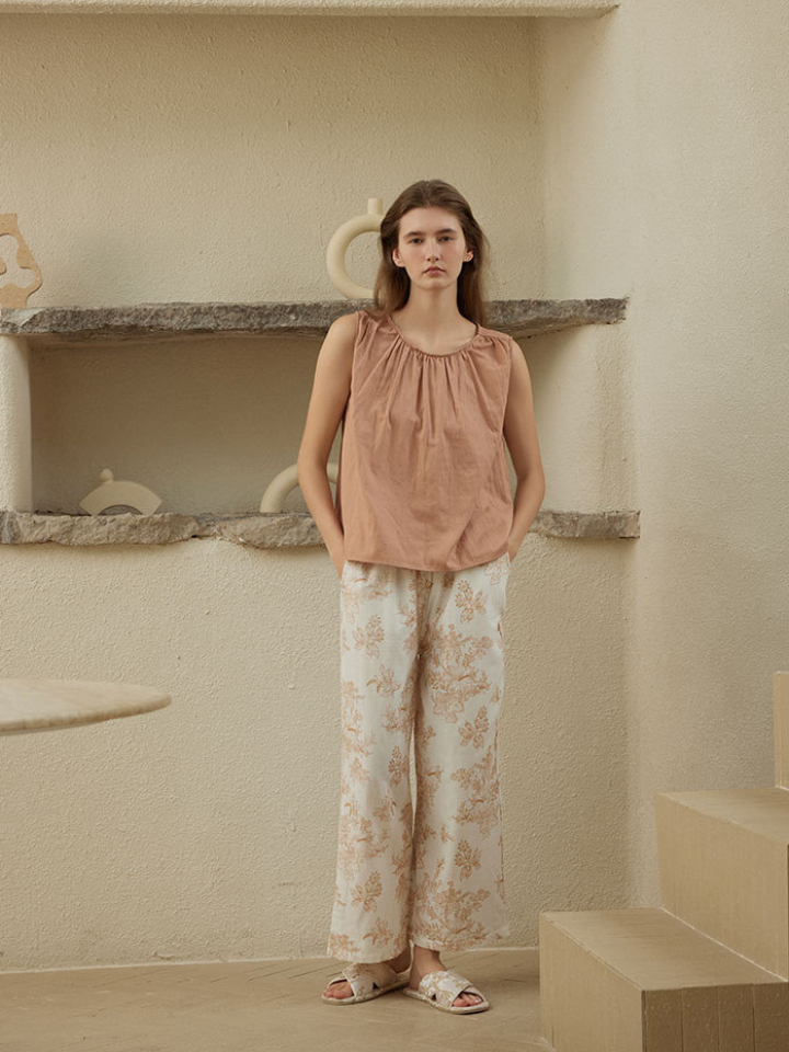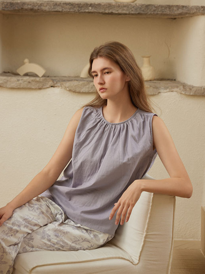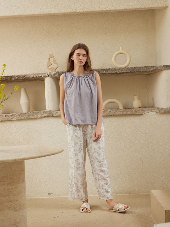 シンプルなベストデザインと、足元をすっきり見せるパンツのシルエットが、くつろぎながらもおしゃれを楽しめる仕様。