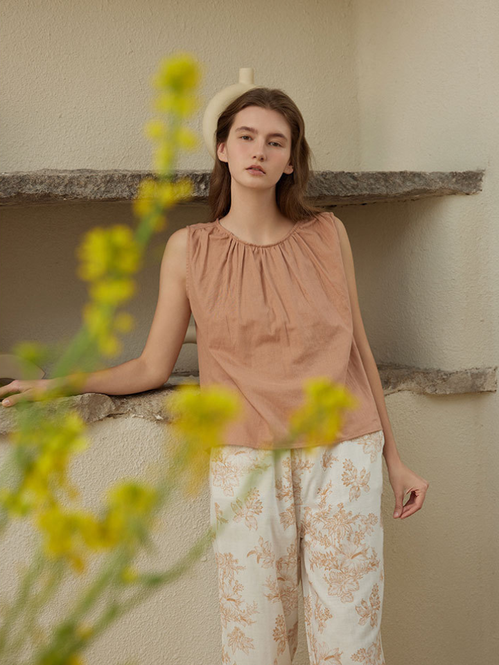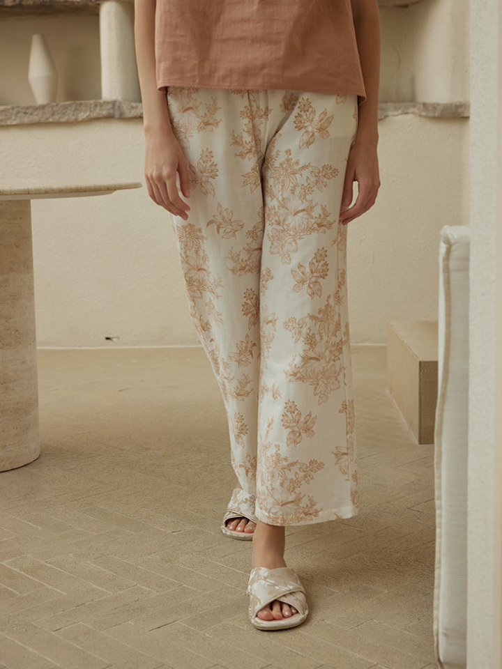 パンツのボタニカル柄とベストの色味が見事に調和し、統一感のある洗練されたルックスに。