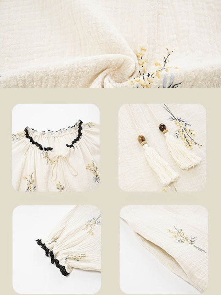 ほのかに揺れるフリンジと、エレガントなフラワー刺繍が、ほのかに華やかさを添えます。