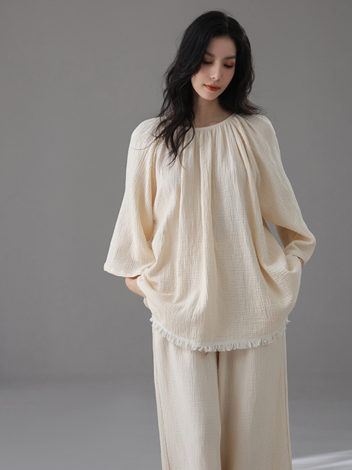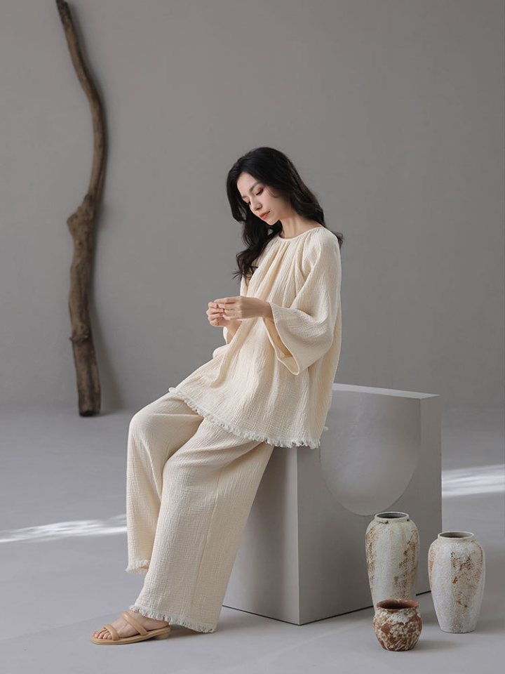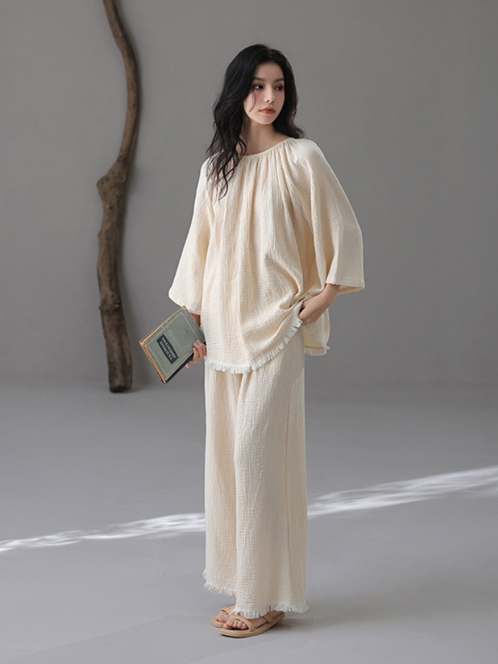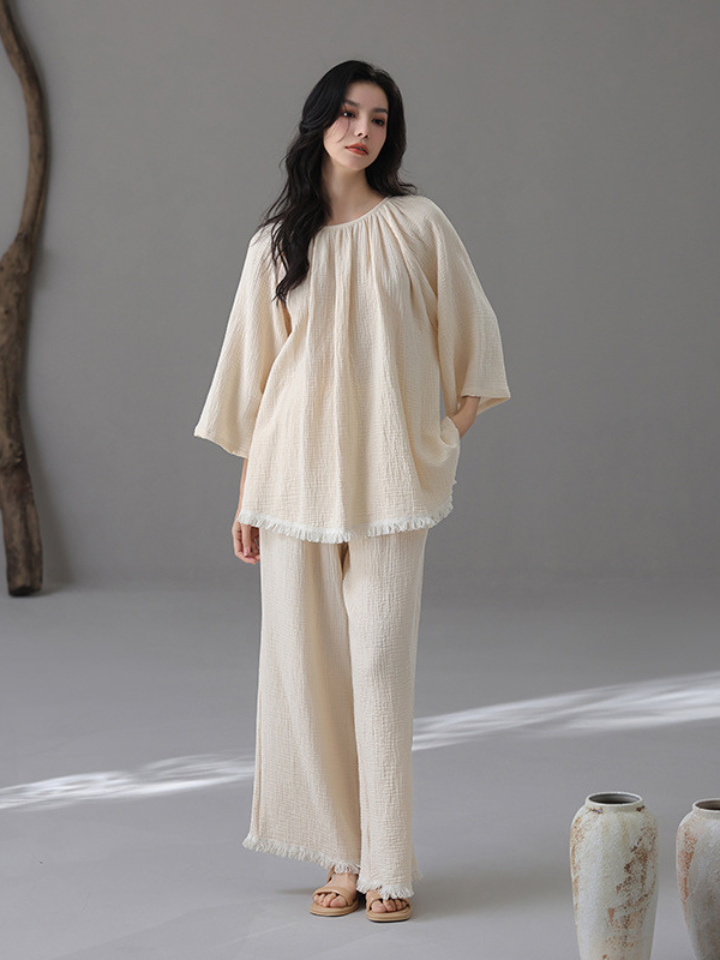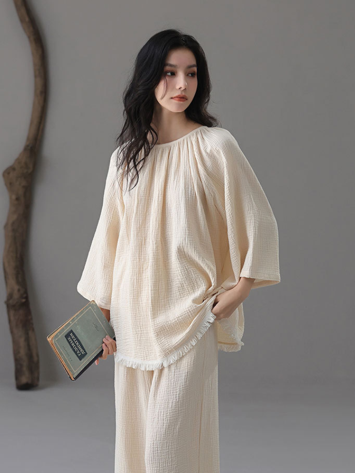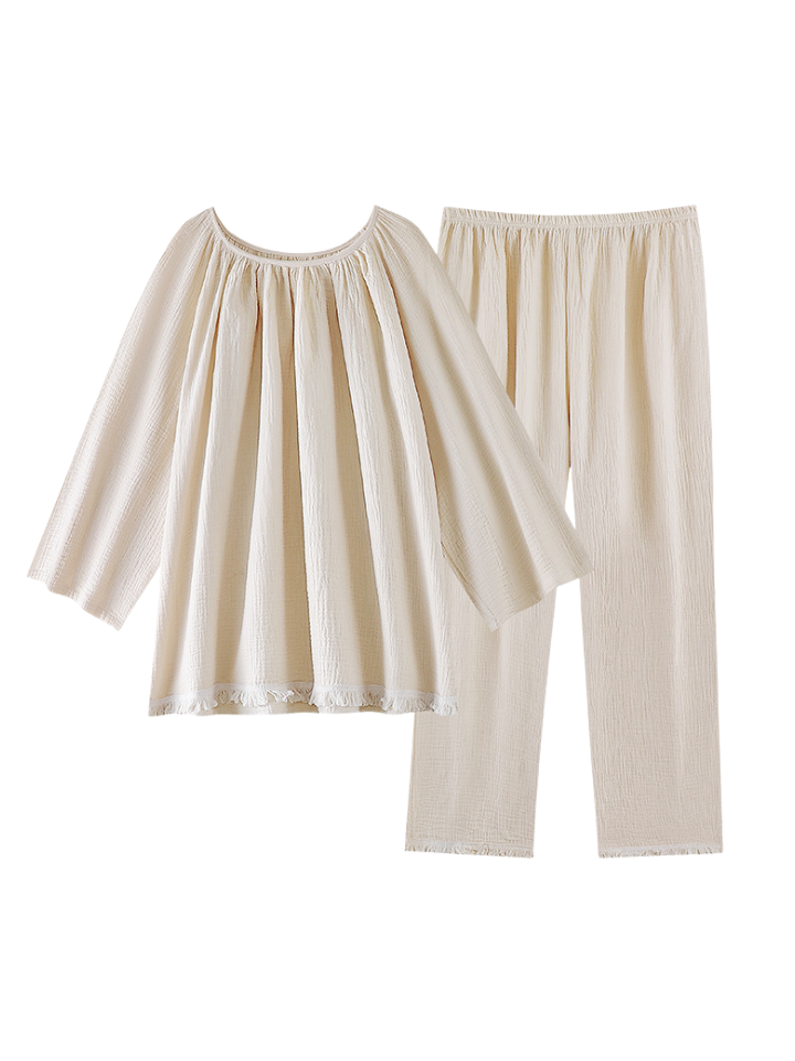 裾フリンジ 純綿ルーズフィットパジャマ