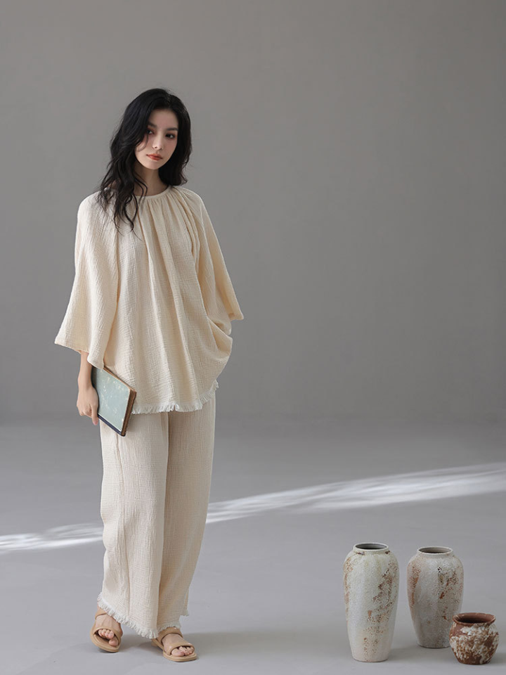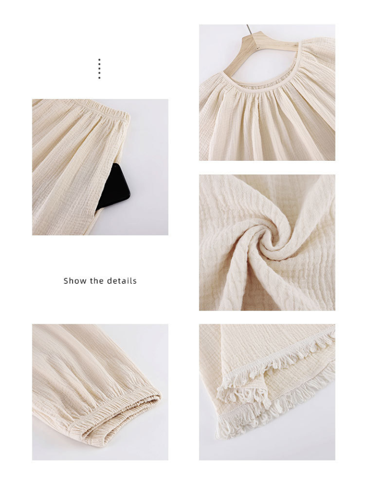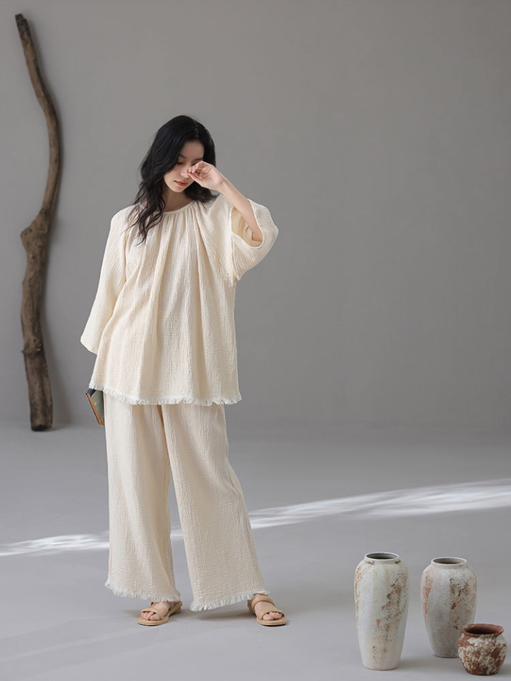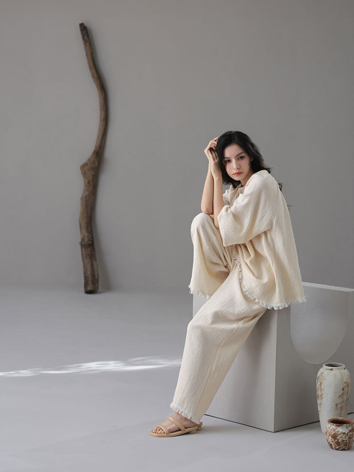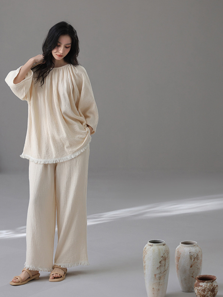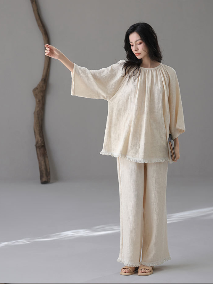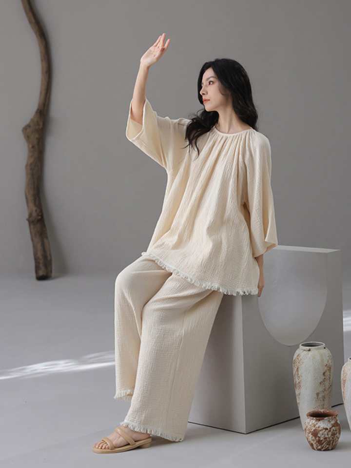 裾フリンジ 純綿ルーズフィットパジャマ